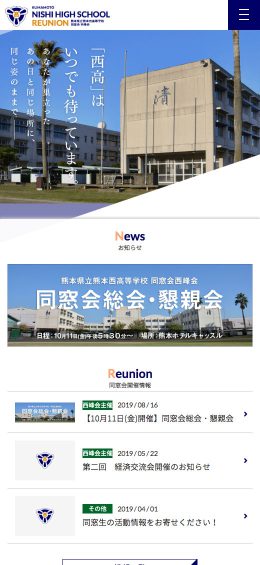 熊本県立熊本西高等学校 同窓会 西峰会(せいほうかい)様のホームページを制作させていただきました。更新システムの導入により、在校生や卒業生の活動・活躍についてのお知らせなども発信可能です。約15,000人を超える同窓生に、より多くの情報をいち早く発信できるツールとしてご活用いただいています。