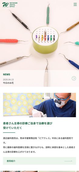 渡辺歯科医院様のホームページをリニューアルさせていただきました。渡辺歯科医院様は、熊本市健軍商店街「ピアクレス」中央にある歯科医院です。常に最新の歯科医療を念頭に置きながらも、説明と承諾を基本とした患者さん主導の診療を心がけております。