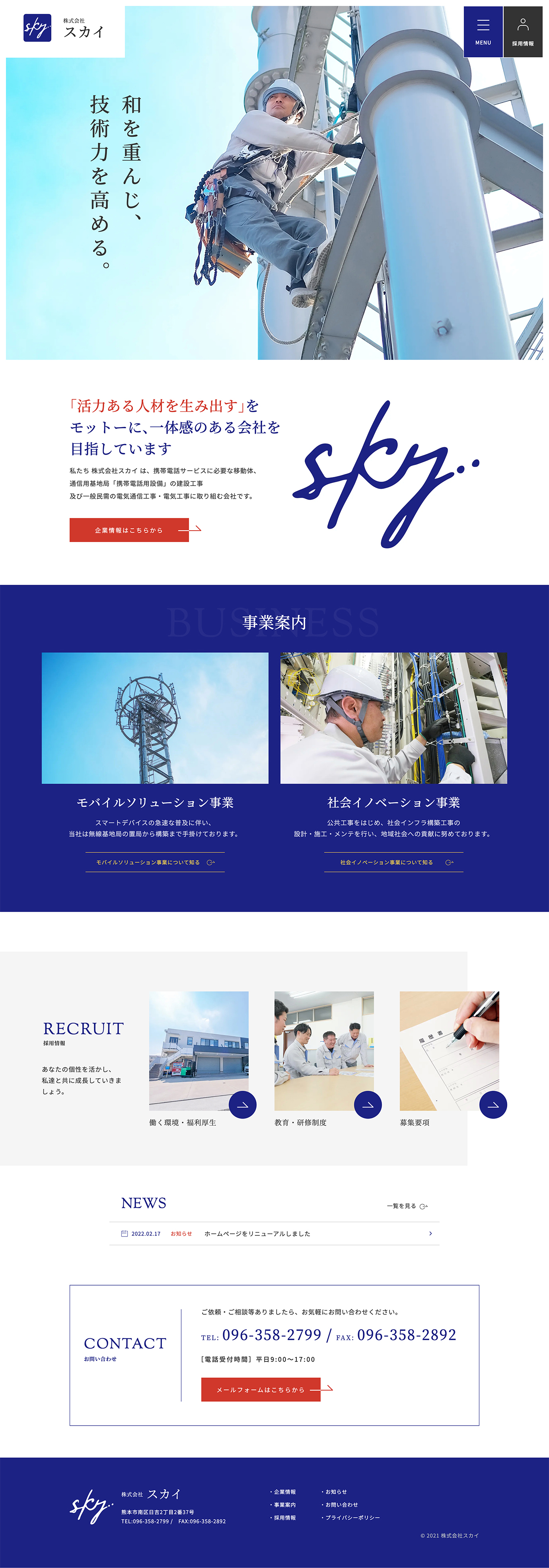 熊本県熊本市南区日吉にあります電気通信工事・電気工事業「株式会社 スカイ」様のホームページを制作いたしました。
