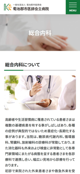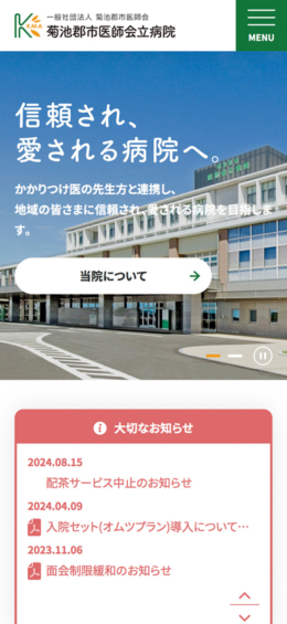 熊本県菊池市の、菊池郡市医師会立病院様のホームページをリニューアルいたしました。同院では、チーム医療と医療連携に取り組み、地域の皆様が住み慣れた菊池の地で快適に治療・療養が出来るよう、充実した医療・療養環境を提供されています。今回のリニューアルでは職員採用に力を入れておられたため、新たに採用コンテンツ制作や看護部ページの充実化を図りました。