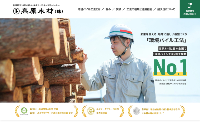 熊本に本社を構え、福岡や沖縄などにも拠点を置かれている創業明治38年の杭木・矢板などの木材総合メーカー 高原木材様の環境パイル工法に特化したLPを制作いたしました。環境パイル工法とは、戸建て住宅を中心に全国各地での累計施工実績が5万棟を超す安心の第三者認定工法です。近年では、非住宅物件での採用も多く、普段利用している公共物を支えています。高原木材様は創業100年以上で培ったネットワーク、経験と知恵が豊富なプロフェッショナル集団です。